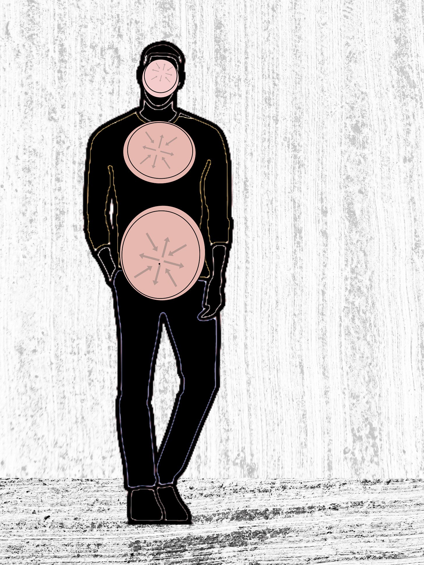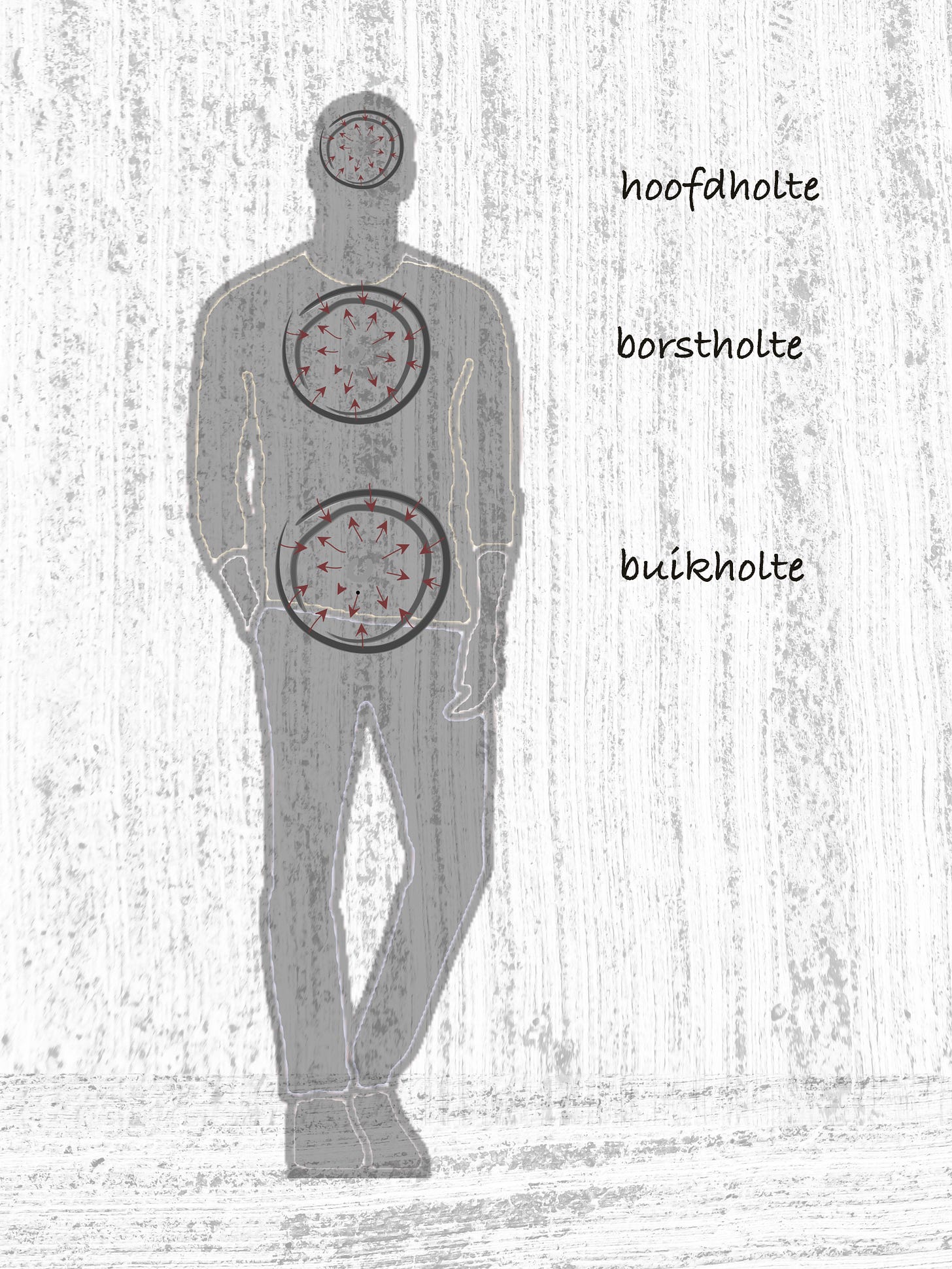 Stel je een regenworm voor, met slechts drie compartimenten. Draai het geheel 90 graden, denk er ledematen bij, en voilà, de energetische functionaliteit van een menselijk lichaam in een gereduceerde vorm. Drie fundamentele holtes worden van elkaar gescheiden en met elkaar verbonden door tussengebieden met een regulerende sluiswerking. De top van het geheel wordt gevormd door de fontanel, de bodem door het perineum.