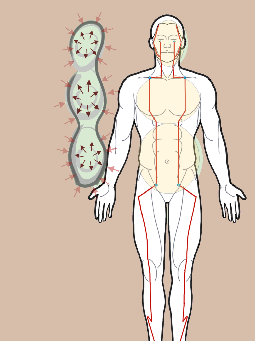 The transition areas between the three fundamental body cavities determine the speed of circulation. They function as valves. If they are closed slightly, the speed increases. If so much tension builds up in the intermediate areas that the valves are effectively closed, circulation stops.